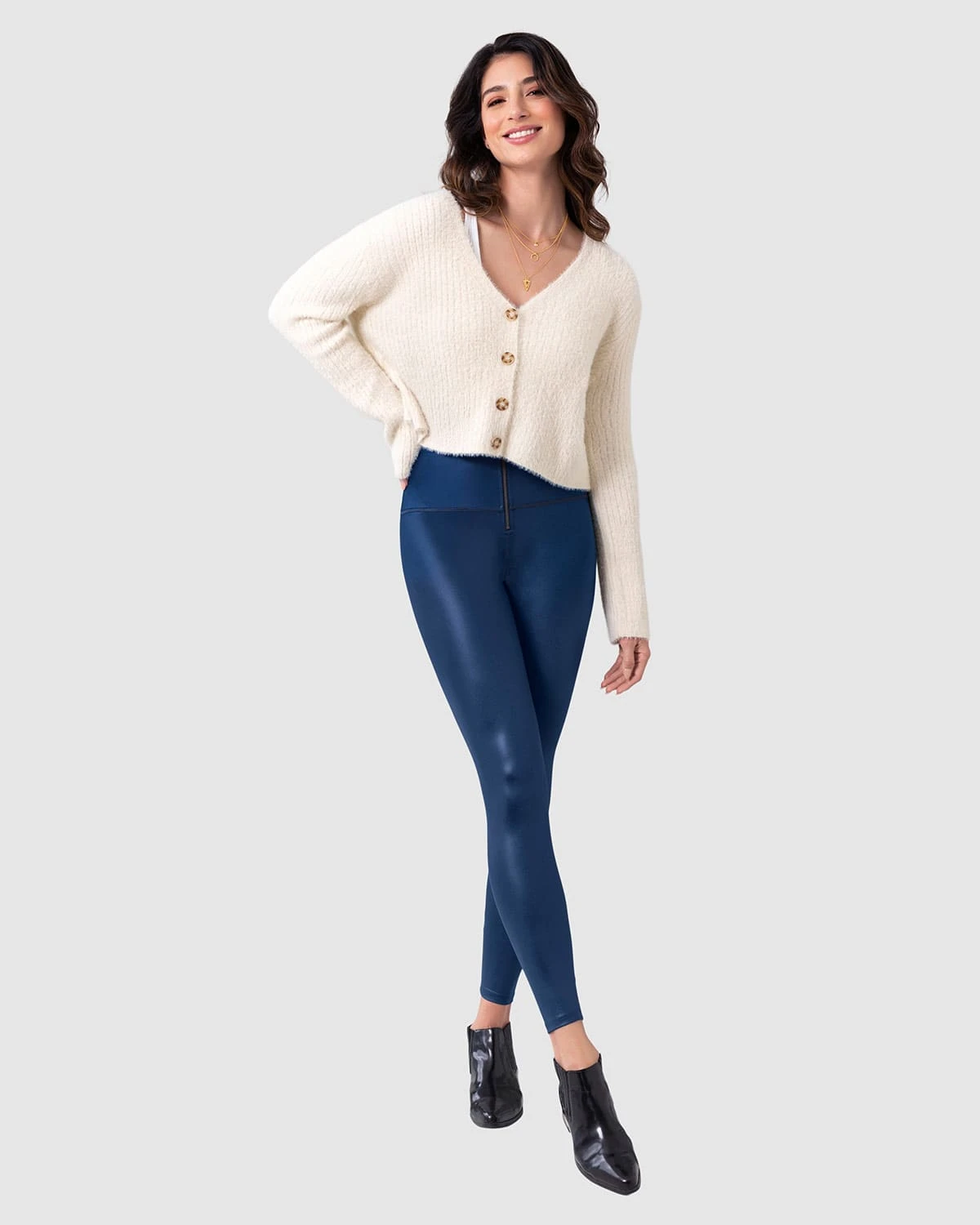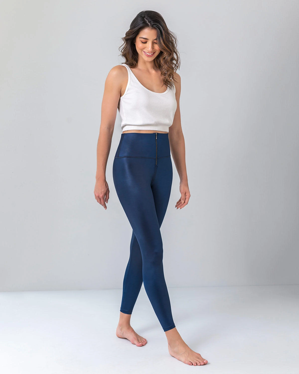 This legging is the perfect combination of sculpting compression and impeccable style. It has a faux-leather finish for standout style. This high-waisted legging has an inner layer of our trademark PowerSlim®® ®®® firm compression fabric to flatten your tummy and sculpt your waist. The front has a functional zipper for easy wear.