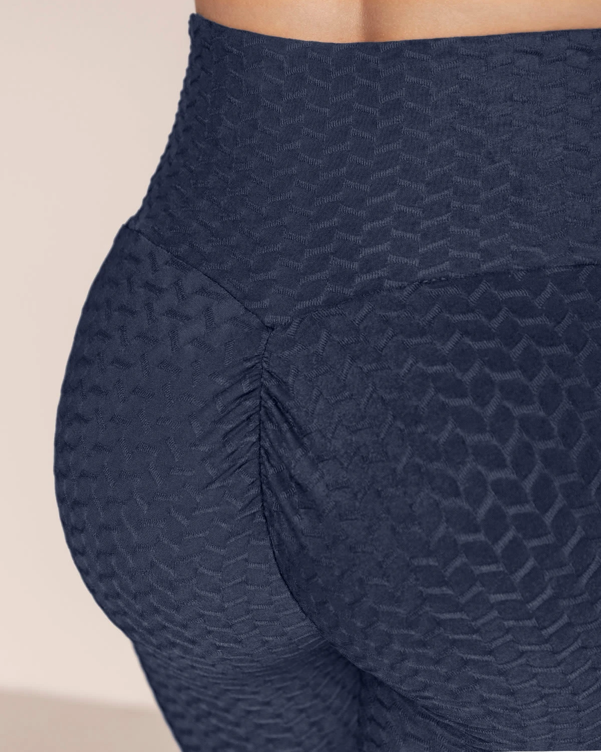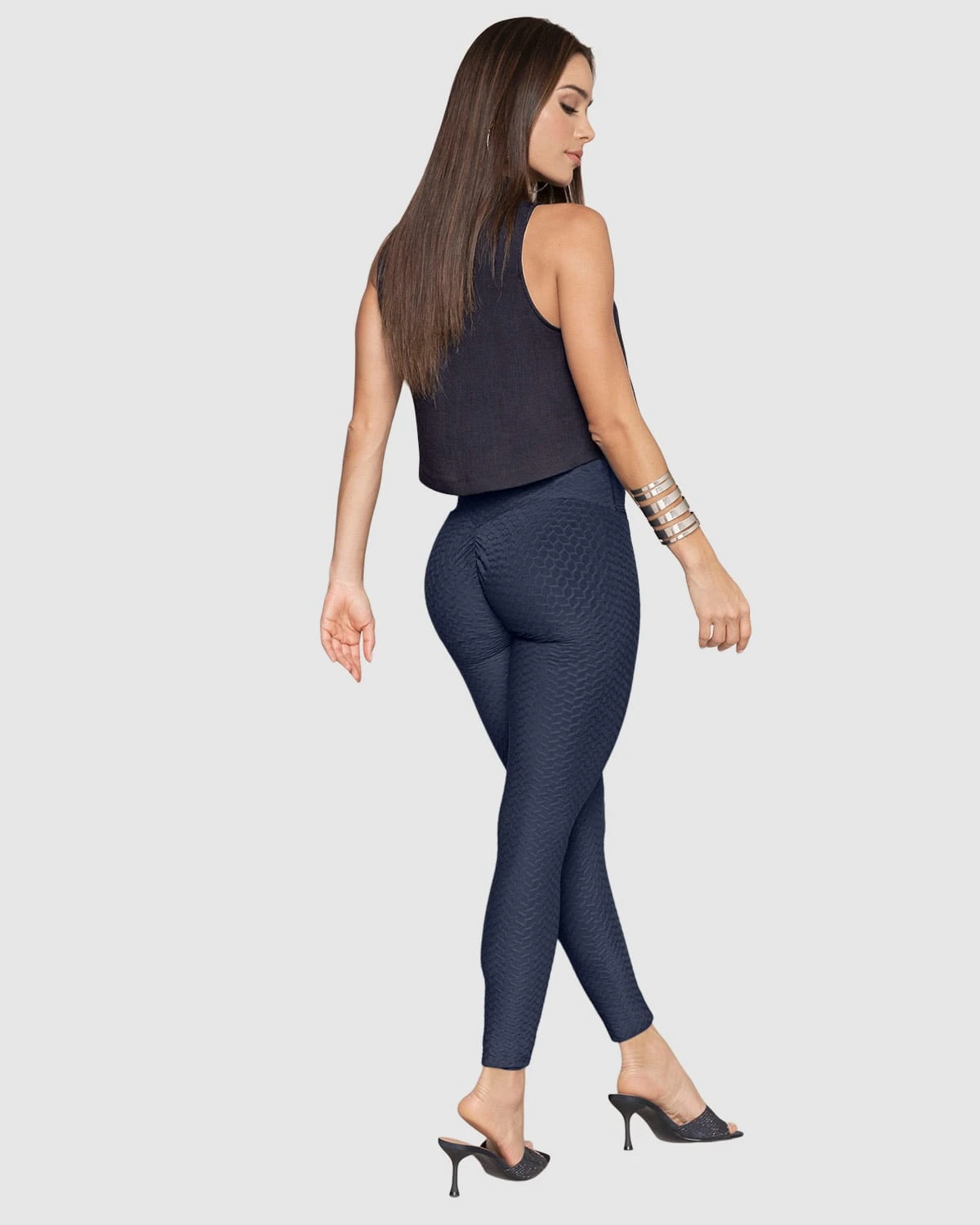 A butt-lifting legging that has slimming compression in the tummy for a flattening effect. The double-layered waistband smooths out your curves. It has a ruched seam for a natural-looking butt-lifting, rounding effect. The textured fabric gives this legging a refined look while hiding cellulite. This legging is perfect for many looks: casual, travel, leisure, or even working out. Pair it with long tops, jackets, tunics, and shirts to show off your curves every day!