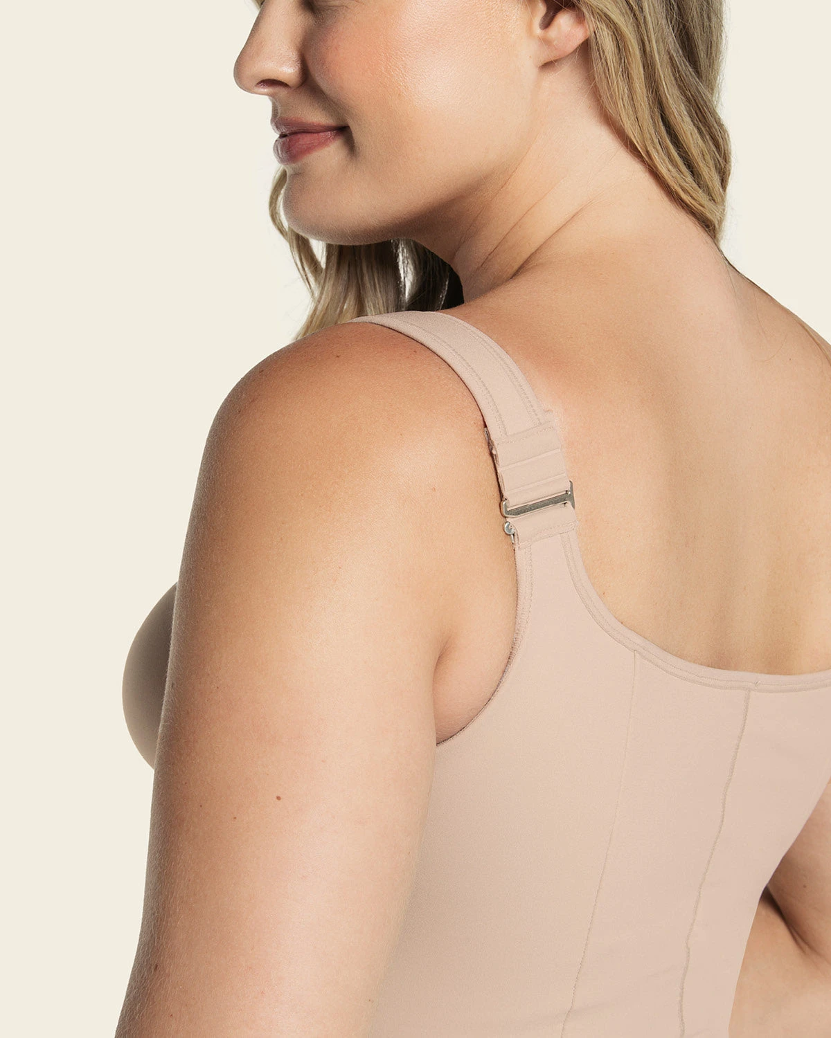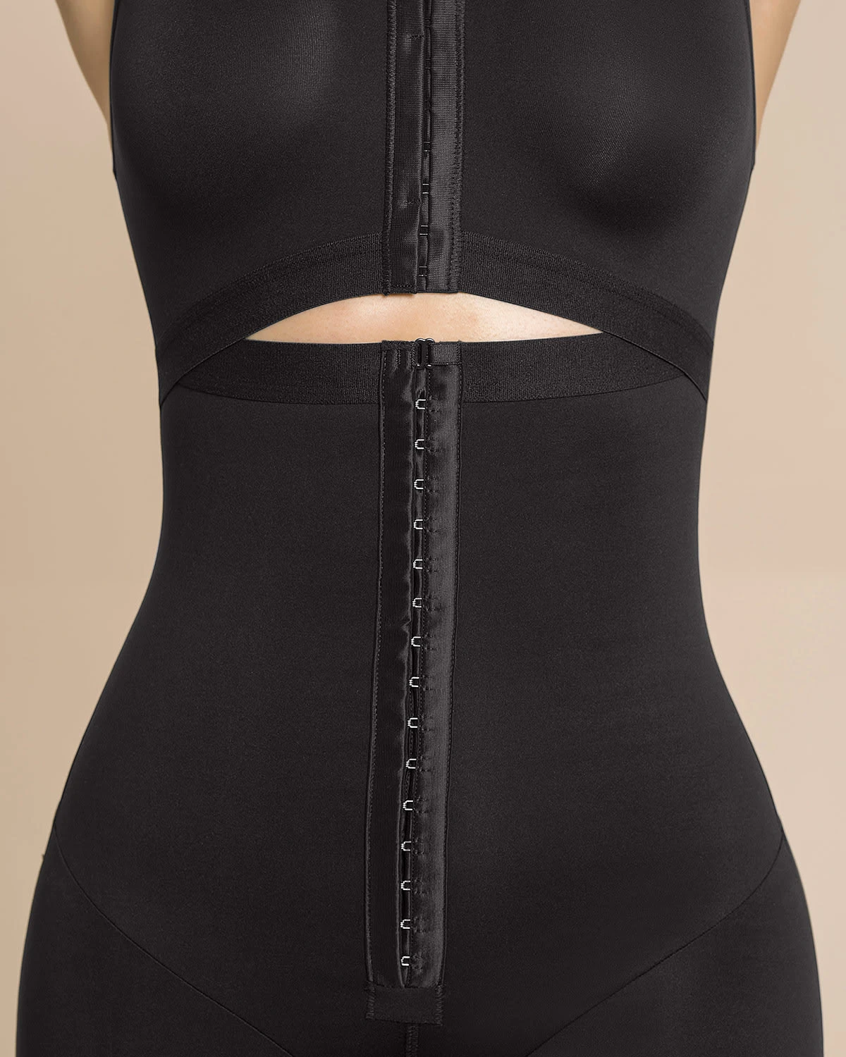 - The body shaper has a 3-level adjustable front hook-and-eye closure.