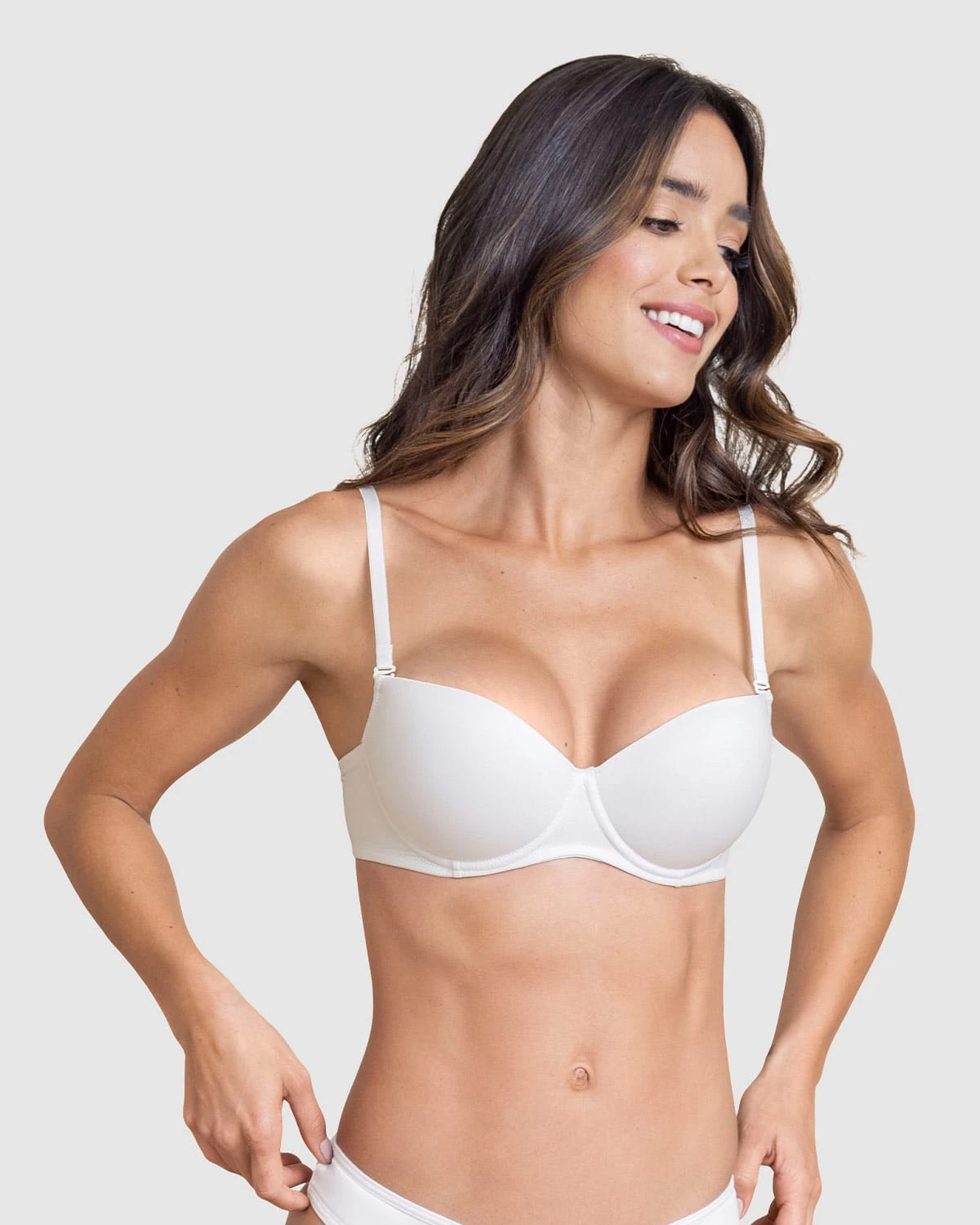 A demi-cup bra that has underwire and built-in push-up padding for a rounded, lifted look and a volumizing effect. The cups are soft and light, designed to not show through your clothes. The back is stretchy and offers medium coverage. 4-level adjustable back hook-and-eye closure. Adjustable straps can be worn classic, criss-cross, or halter.